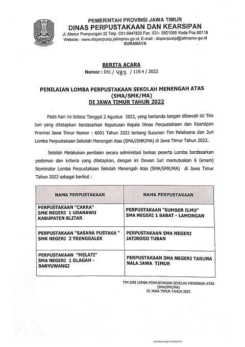Nominasi 6 Besar Lomba Perpustakaan Provinsi Jawa TimurDiterbitkan: Selasa, 02 Agustus 2022 13:52 | Ditulis oleh Tim ICT | | | Dilihat: 604Penilaian: 0 / 5Silakan nilai Bintang 1 Bintang 2 Bintang 3 Bintang 4 Bintang 5 < SebelumnyaBerikutnya > Untuk memberikan komentar, anda diharuskan Login terlebih dahulu !!